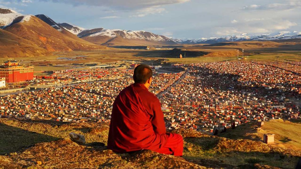 亚青的白塔,转经筒,寺庙气势磅礴,数千间信徒居住的小木屋围绕而建,纵横交错的河流包围着整个寺庙的建筑群,每当清晨或黄昏,炊烟弥漫,河水闪耀着金光,诵经声远远传来,犹如天籁,动人心弦。亚青寺又称觉姆岛,在这里修行的绝大部分都是觉姆,在三十余年的时光里,她们依靠自己的双手建起了一座座小木屋。虽然每间小木屋不足十平米,缺少光的照耀。冬季里大雪纷飞,气候恶劣,但他们仍然坚持着内心最平静的修行和生活。